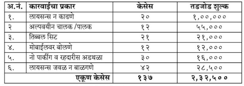 कोल्हापूर : कोल्हापूर शहरातील शाळा, महाविद्यालय परिसरात अल्पवयीन वाहनधारक, विना लायसन्स, तिब्बल सिट, मोबाईल टॉकींग या वाहतुक नियमांचे उल्लंघन करणारे १३७ वाहनचालकांवर कारवाई करण्यात आली. त्यांचेकडून २,३२,५००/- रुपये दंड करण्यात आला. ही कारवाईची मोहीम कोल्हापूर वाहतूक शाखेने केली.