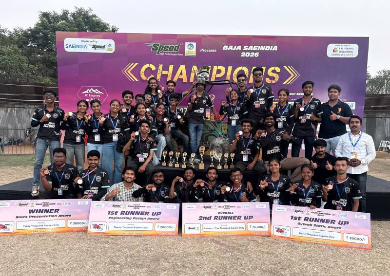 कोल्हापूर : डी. वाय. पाटील स्वायत्त अभियांत्रिकी महाविद्यालयाच्या मेकॅनिकल इंजिनिअरिंग विभागातील विद्यार्थ्यांनी राष्ट्रीय स्तरावरील प्रतिष्ठेच्या ‘एसएई इंडिया बाहा २०२६’ स्पर्धेत तब्बल १० पुरस्कारांवर नाव कोरले आहे. नरसापूर (हैद्राबाद ) येथे या स्पर्धेत महाविद्यालयाच्या ‘डीवायपीसीइटी व्हेक्टर्स’ या संघाने उत्कृष्ट कामगिरी करत राष्ट्रीय पातळीवर एकूण ५१ संघांमध्ये तिसरा क्रमांक पटकावला.