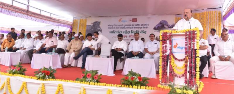 कोल्हापूर : कोल्हापूर जिल्हा सहकारी दूध उत्पादक संघ मर्या.,कोल्हापूर (गोकुळ) व एन.डी.डी.बी. डेअरी सर्व्हिसेस, नवी दिल्ली यांच्या संयुक्त विद्यमाने उभारण्यात आलेल्या लिंगनूर (क.नूल) ता. गडहिंग्लज येथे जातिवंत मुऱ्हा, मेहसाणा,जाफराबादी म्हैशी विक्री केंद्राचे उद्घाटन महाराष्ट्र राज्याचे वैद्यकीय शिक्षण मंत्री हसन मुश्रीफ यांच्या हस्ते व आरोग्य मंत्री तथा पालकमंत्री प्रकाश आबिटकर, माजी गृहराज्यमंत्री आमदार सतेज पाटील, माजी आमदार राजेश पाटील यांच्या प्रमुख उपस्थितीमध्ये करण्यात आले. यावेळी गोकुळचे चेअरमन नविद मुश्रीफ व सर्व संचालक मंडळ, एन.डी.डी.बी.चे प्रतिनिधी, प्राथमिक दूध संस्थांचे प्रतिनिधी, गोकुळचे अधिकारी यांच्या उपस्थित होते.