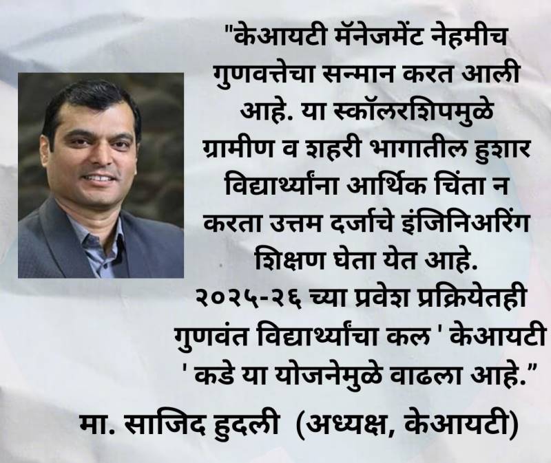 केआयटी कॉलेजमध्ये २६ गुणवंत विद्यार्थ्यांना 'मेरीट स्कॉलरशिप 'चे वितरण