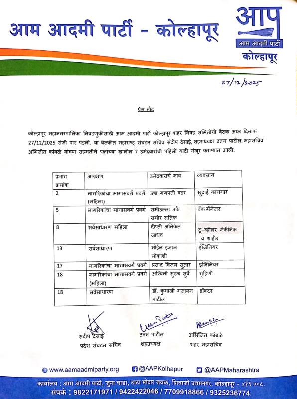 कोल्हापूर महानगरपालिका निवडणूक : 'आप'ने जाहीर केली पहिली यादी, इंजिनियर, डॉक्टर ते कामगारांचा समावेश