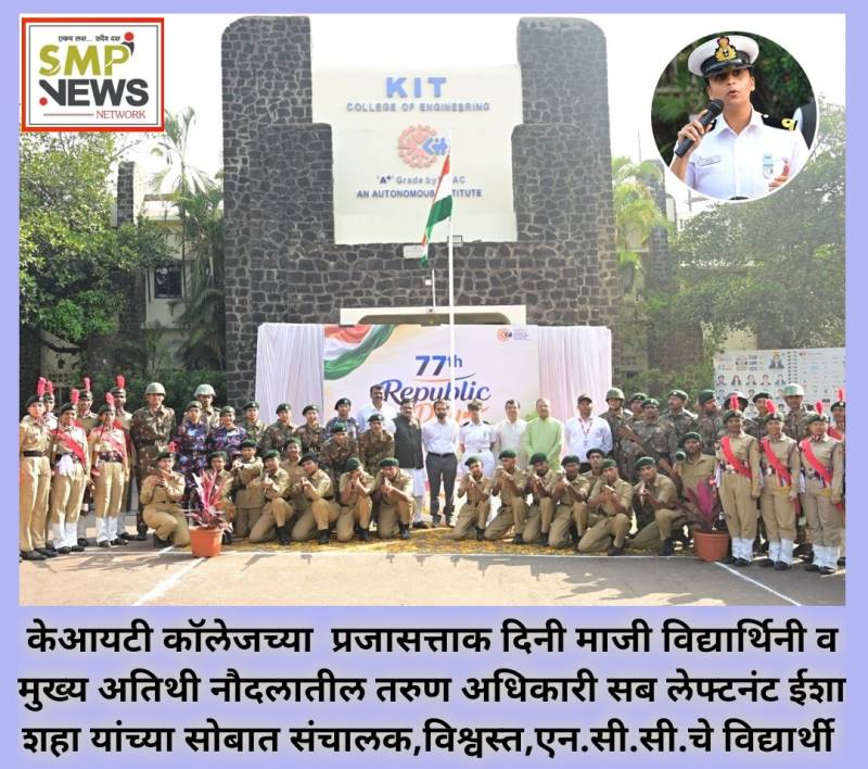 कोल्हापूर : केआयटी अभियांत्रिकी (प्रदत्त स्वायत्त) महाविद्यालयामध्ये ७७ वा प्रजासत्ताक दिन साजरा करण्यात आला. या प्रसंगी मुख्य अतिथी म्हणून भारतीय नौसेनेतील अधिकारी व केआयटीच्या माजी विद्यार्थिनी सब.लेफ्ट. ईशा शहा उपस्थित होत्या.