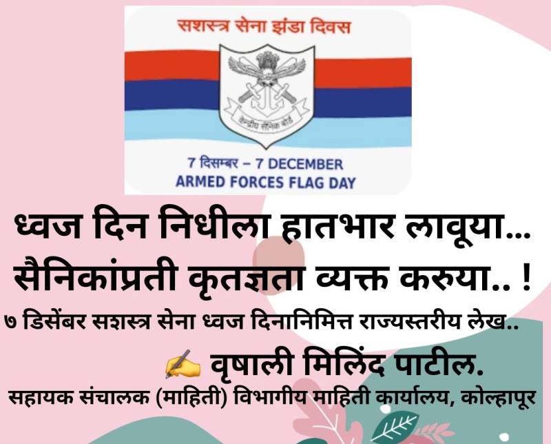 मातृभूमीच्या रक्षणासाठी, देशाच्या सार्वभौमत्वासाठी आणि भारतीयांच्या सुरक्षिततेसाठी रात्रंदिवस सीमेवर तैनात असणाऱ्या आपल्या शूर सैनिकांच्या शौर्य, समर्पण आणि देशसेवेला सलाम करण्याचा दिवस म्हणजे सशस्त्र सेना ध्वज दिन.! केंद्र आणि राज्य शासनाच्या वतीने सैनिक आणि त्यांच्या कुटुंबियांसाठी अनेक योजना राबवल्या जातात. परंतु देशवासीयांनाही सैनिकांप्रती कर्तव्य बजावण्याची संधी मिळावी आणि जनसहभागातूनही सैनिक आणि त्यांच्या कुटुंबीयांच्या कल्याणासाठी थेट निधी देता यावा, यासाठी ध्वज दिन निधी संकलन करण्यात येतो. दरवर्षीप्रमाणे यावर्षीही ७ डिसेंबर रोजी सशस्त्र सेना ध्वज दिन राष्ट्रभक्तीच्या उत्साहात देशभर साजरा केला जात आहे..