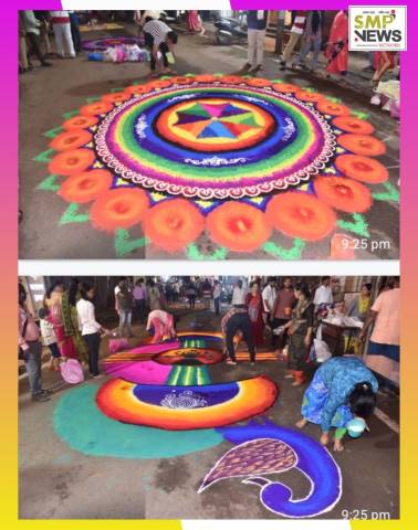 पावसातही कलावंताकडून रांगोळी सादर
