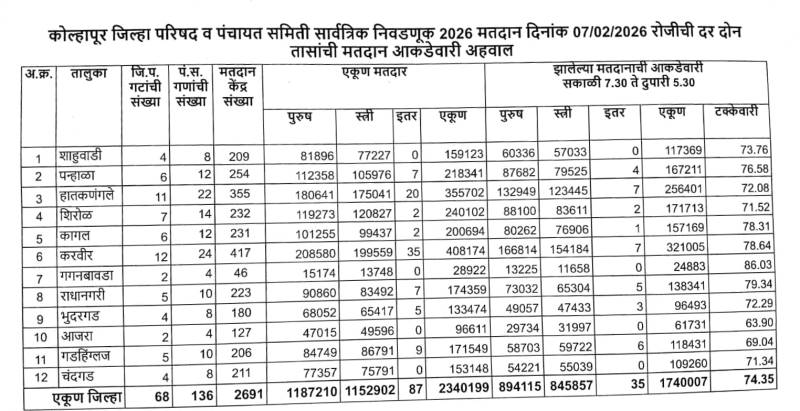 कोल्हापूर : जिल्हा परिषद, पंचायत समिती सार्वत्रिक निवडणूक 2026 अंतर्गत सकाळी 7.30 ते सायंकाळी 5.30 वाजेपर्यंत मिळालेल्या अधिकृत आकडेवारीनुसार जिल्ह्यातील एकूण 2 हजार 691 मतदान केंद्रांवर 74.35 टक्के मतदानाची नोंद झाली आहे.