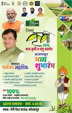 कोल्हापूर : खासदार धनंजय महाडिक यांच्या संकल्पनेतून १७ वर्षापूर्वी सुरू करण्यात आलेले पश्चिम महाराष्ट्रातील सर्वात भव्य असे भिमा कृषी व पशु प्रदर्शन १३ ते १६ फेब्रुवारी २०२६ या कालावधीत आयोजित करण्यात आले आहे. शेतकऱ्यांना शेतीसाठी उपयुक्त असलेली माहिती मिळणारे व शेतीसाठी आवश्यक असणारे साहित्य एकाच छताखाली खरेदी करता याव्यात यासाठी १८ वे भव्य कृषी व पशूप्रदर्शन मेरी वेदर मैदानावर भरविण्यात आले आहे.