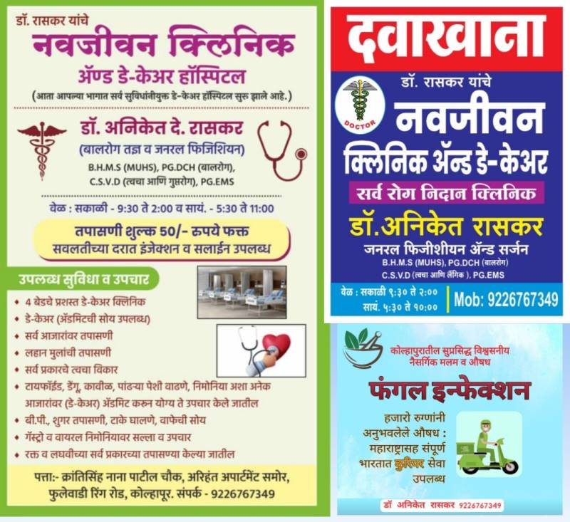 "नवजीवन क्लिनिक" अँड डे-केअर हॉस्पिटल, क्रांतिसिंह नाना पाटील चौक, अरिहंत अपार्टमेंट समोर, फुलेवाडी रिंगरोड, कोल्हापूर. 922 6767 349